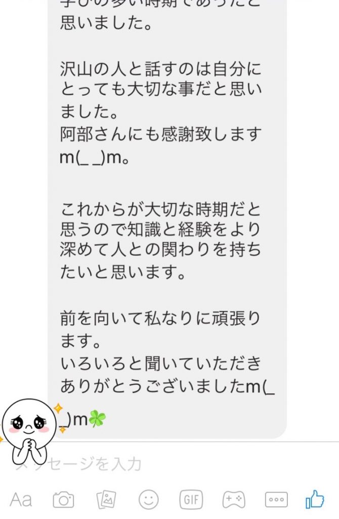 先日、 女性Sさんと 電話セッションをさせていただきました! 以下、素敵なご感想をいただきました(*^^*) ~~~~~~~~~~~~~~~~~ 阿部さん🍀 連絡が遅くなり申し訳ありませんでした。m(_ _)m 話をいろいろ聞いてくださったことに 心からあり... -